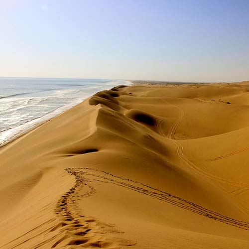 Where the dunes meet the ocean, drive across towering sand dunes that plunge dramatically into the Atlantic, an iconic Namibian experience.